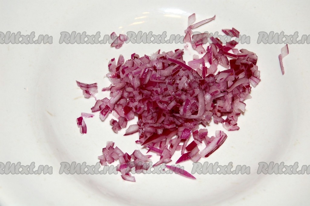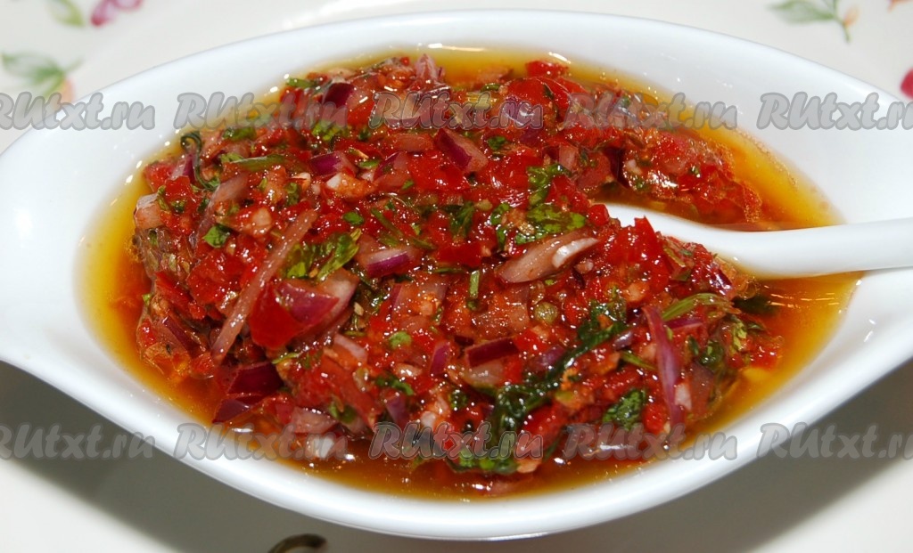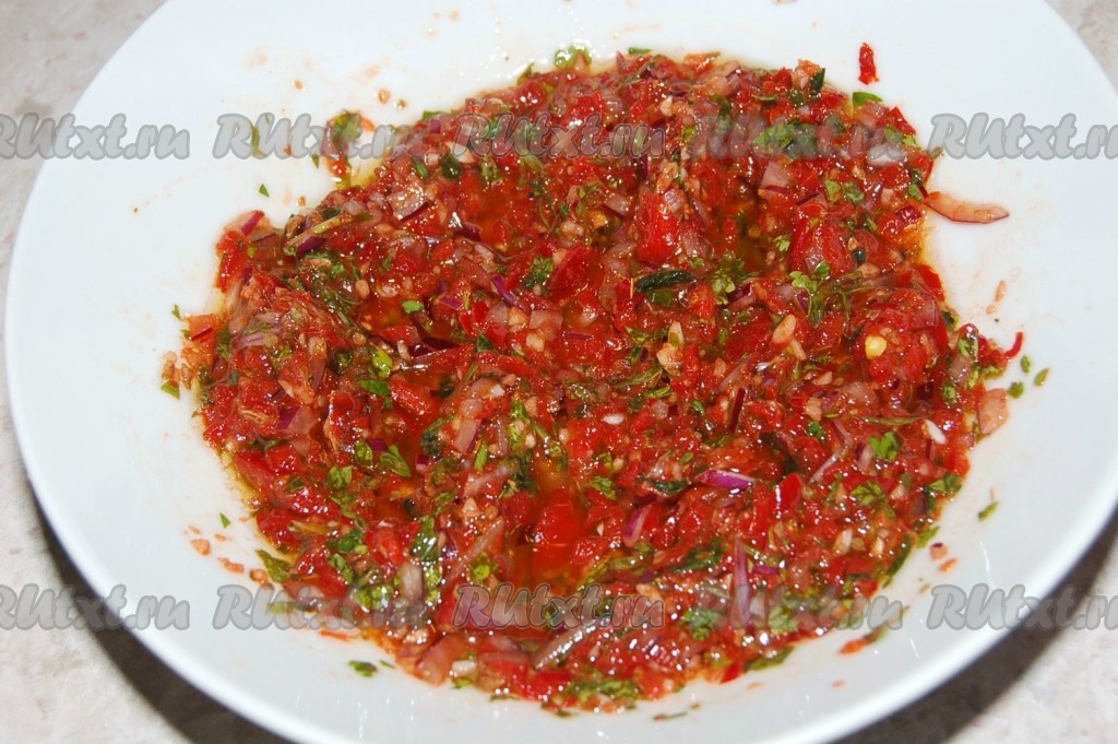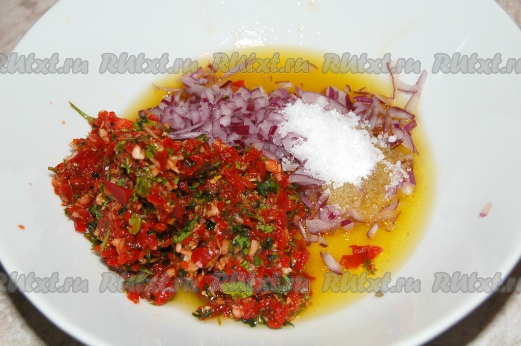 Смесь из перца, чеснока и петрушки переложить в достаточно глубокую миску, добавить нарезанный лук, соль, чёрный молотый перец, влить смесь масла и уксуса.