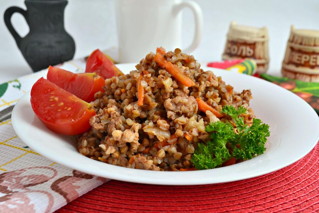 Очень вкусную, ароматную, насыщенную гречку по-купечески, приготовленную с фаршем, подать к столу в горячем виде с соленьями или свежими овощами.
