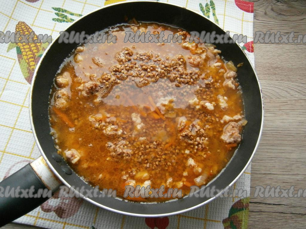 Влить кипяток, добавить перебранную гречневую крупу, перемешать. Накрыть сковороду плотно крышкой.