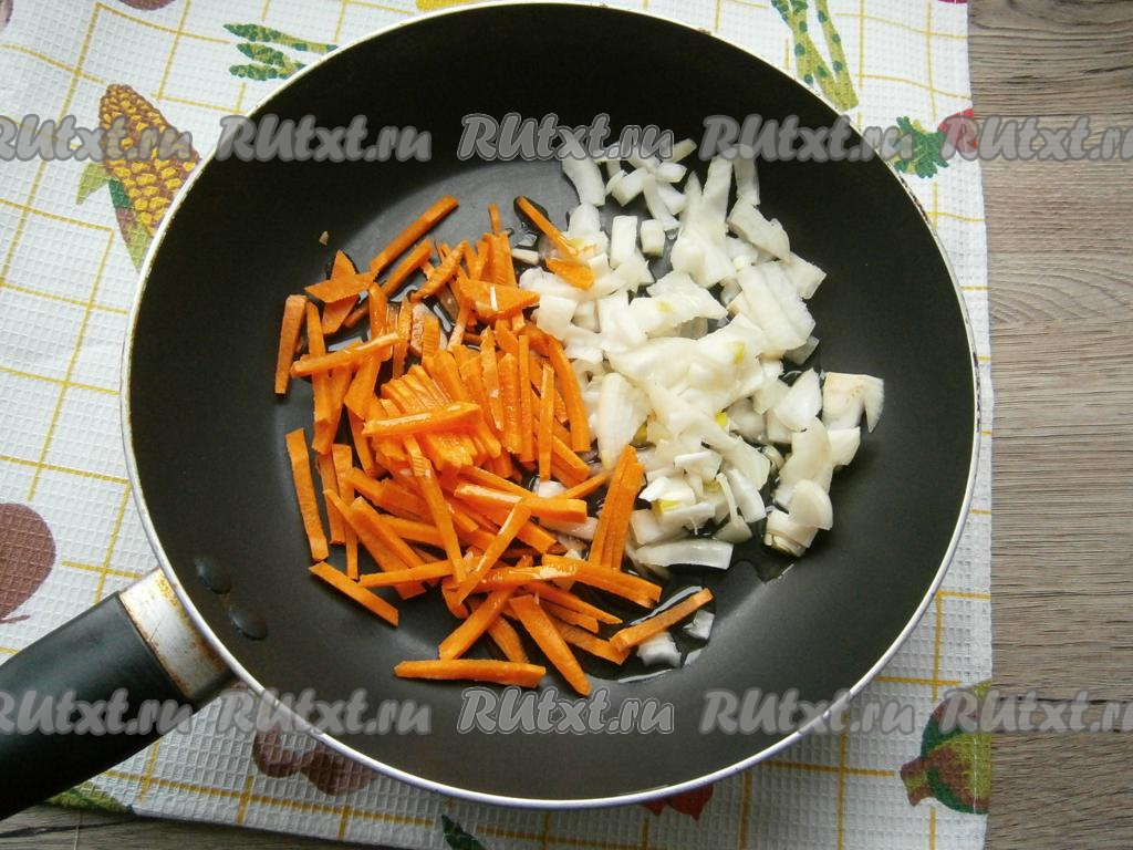 Морковку и лук очистить. Лук нарезать кусочками, морковь - тонкой соломкой, поместить овощи в сковороду, влить растительное масло.