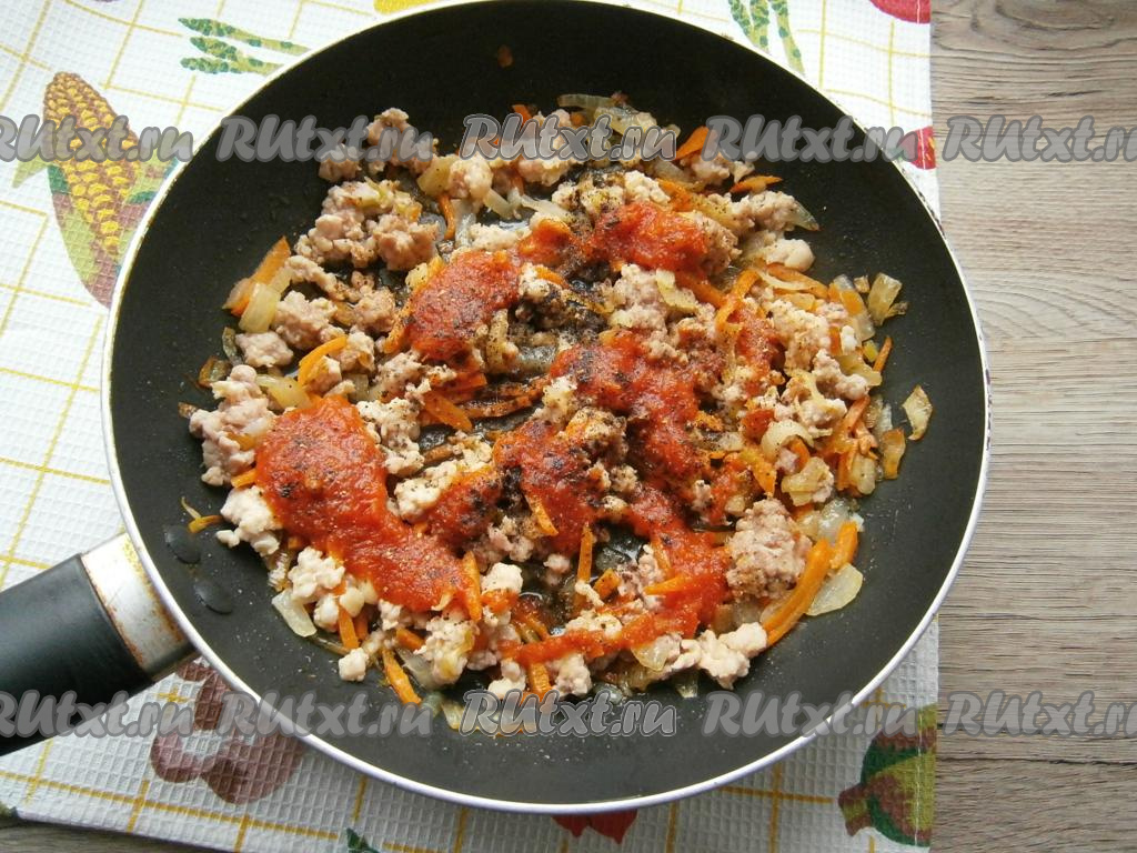 Тщательно перемешать фарш с овощами и обжаривать на среднем огне, разбивая комочки фарша, до изменения цвета мяса (минут 5-6). Далее добавить томатный соус, соль, специи и перец.