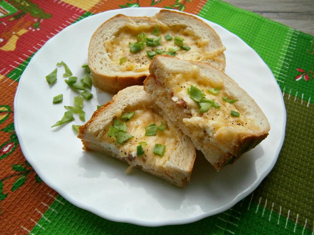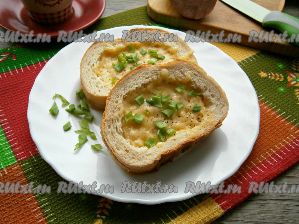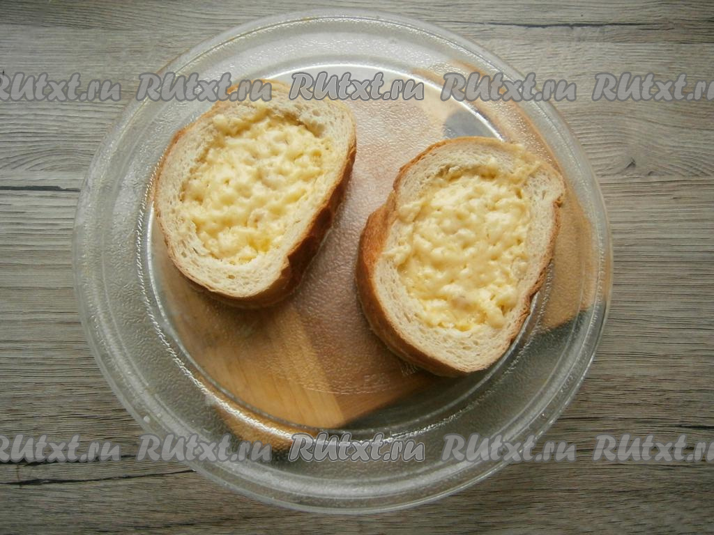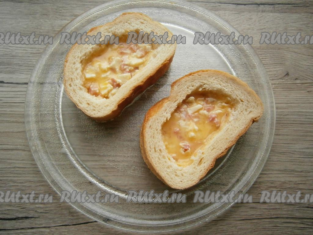 Смазать массой из колбасы и сыра каждый целый ломоть батона так, чтобы в середине её было больше. Накрыть каждый смазанный ломоть батона ломтем с вырезанной серединой (как на фото). Ломти выложить на тарелку из микроволновки. Залить середину взбитым яйцом.
