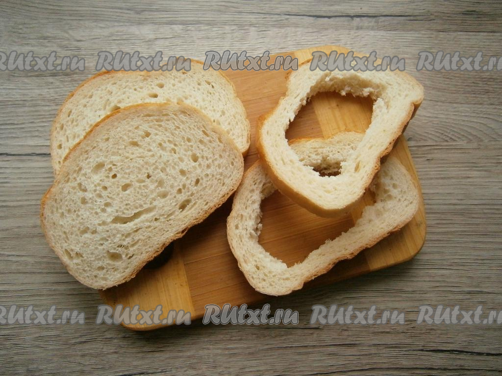 Два ломтя батона оставить целыми, у двух - вырезать мякиш (как на фото).