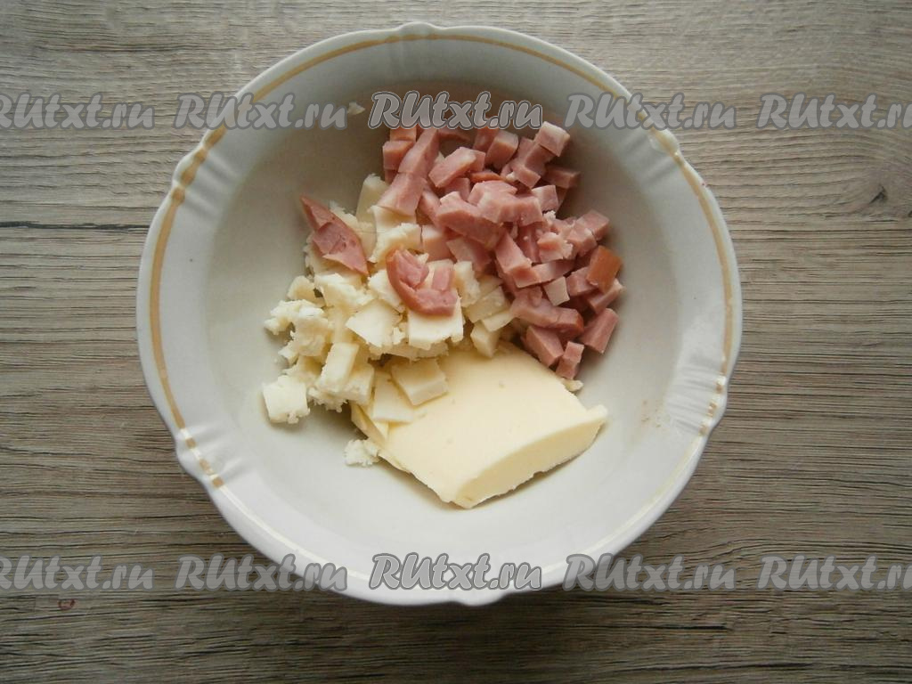 Колбасу нарезать кубиками. К нарезанной колбасе выложить 50 грамм сыра (если сыр твёрдых сортов - его нужно натереть на терке, если сыр мягкий - нарезать кубиками), добавить размягченное сливочное масло, хорошо перемешать.