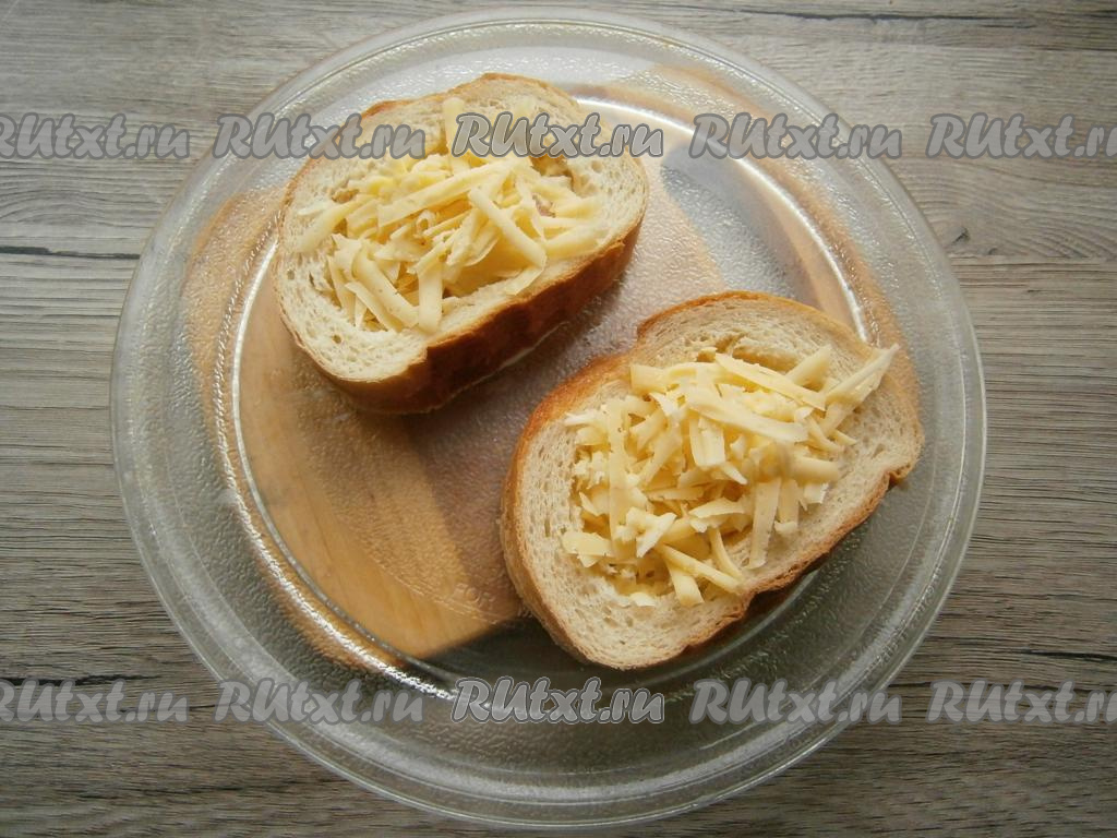 Если яйцо будет немного вытекать, тщательнее придавите края бутербродов. Отправить бутерброды с колбасой и сыром в микроволновку на 3 минуты при мощности 750 Ватт. После этого вынуть горячие бутерброды и сразу посыпать сверху 30-40 граммами натертого твердого сыра.
