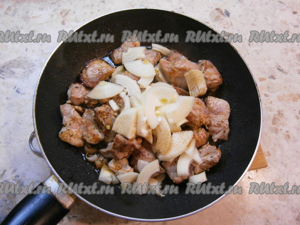 Обжарить свинину с луком в течение 4-5 минут, перемешивая. Затем влить горячую воду, добавить специи для мяса, соль по вкусу, прикрыть сковороду крышкой и тушить мясо на слабом огне 15-20 минут. Практически вся жидкость должна испариться. Добавить к мясу измельченный очищенный чеснок.