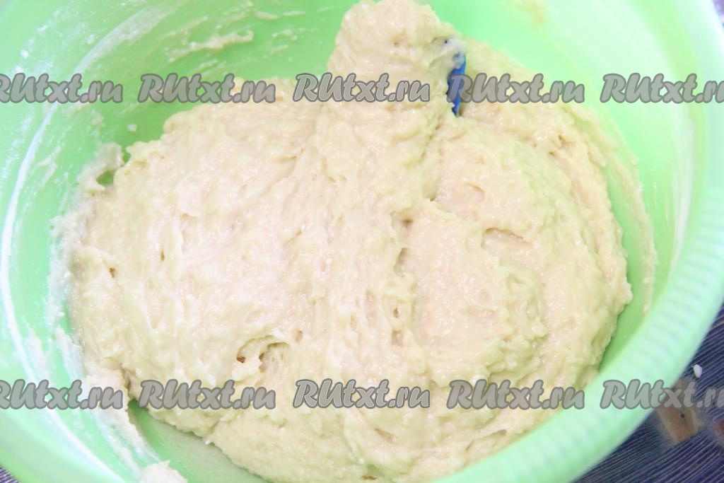 Далее в получившуюся массу добавить смесь дрожжей и молока, ещё раз перемешать. Масса получится достаточно жидкой.