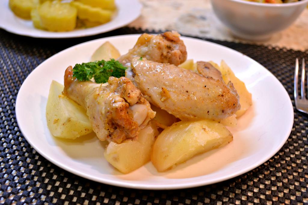 Ароматную и очень вкусную курицу, приготовленную с картофелем в рукаве, достать из духовки и подать к столу в горячем виде.