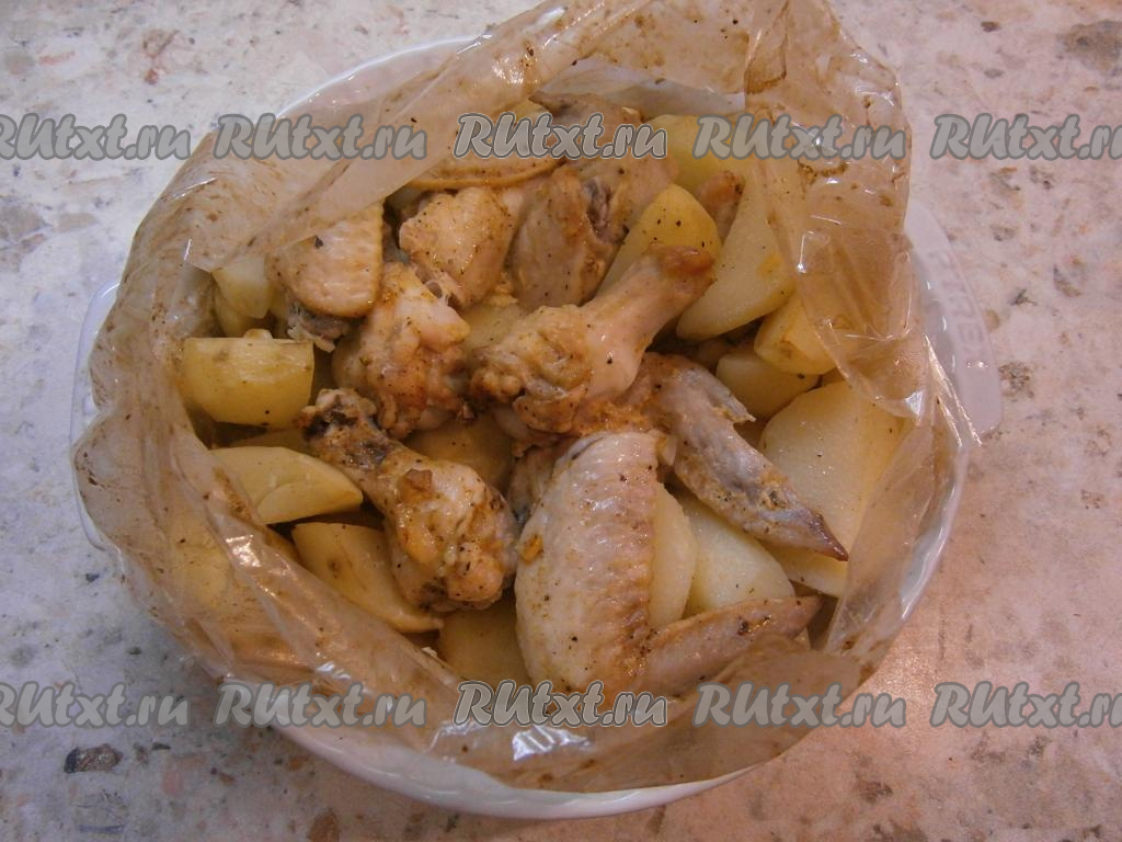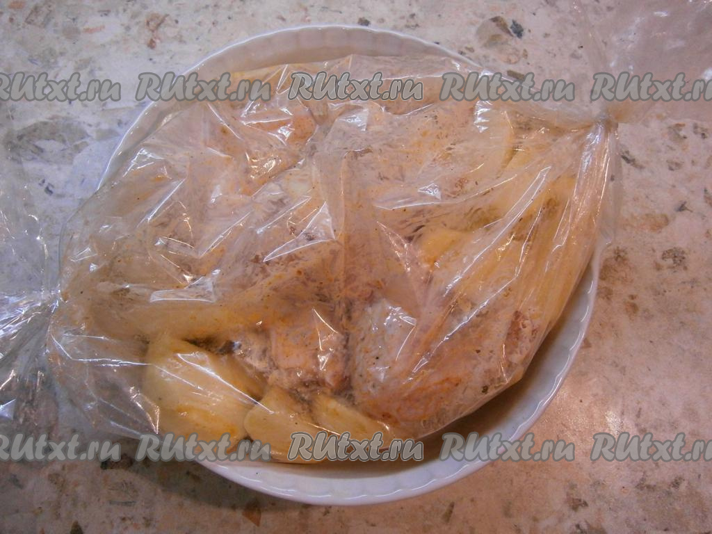 Далее выложить картофель вместе с курицей в рукав для запекания, закрепить края с двух сторон.