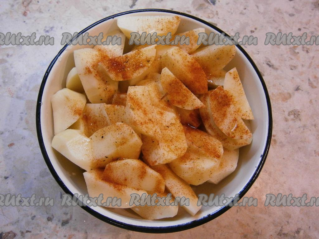 Картошку очистить, разрезать её на 4 части, посыпать специями для картофеля, посолить, влить растительное масло, перемешать, оставить минут на 10.
