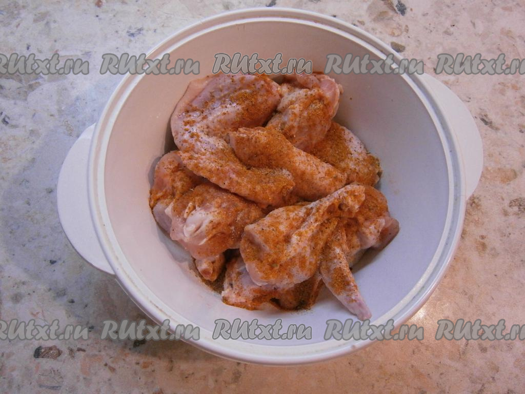 Порционные части курицы хорошо посыпать приправой, посолить, перемешать.