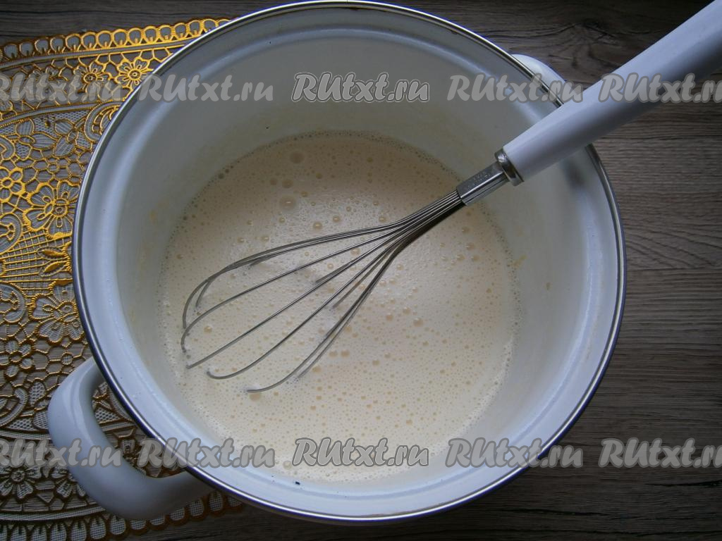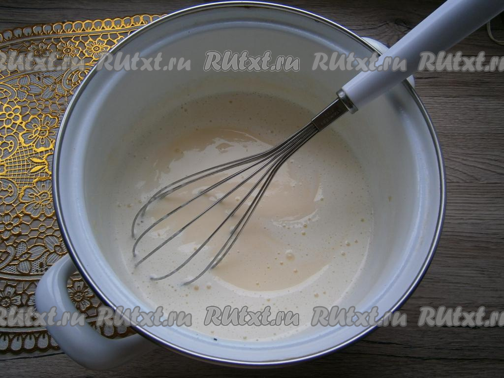 Влить горячие сливки в желтковую массу, тщательно перемешивая венчиком.