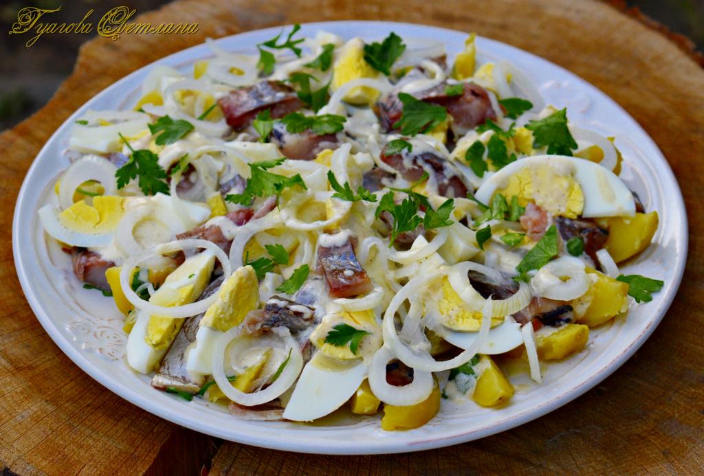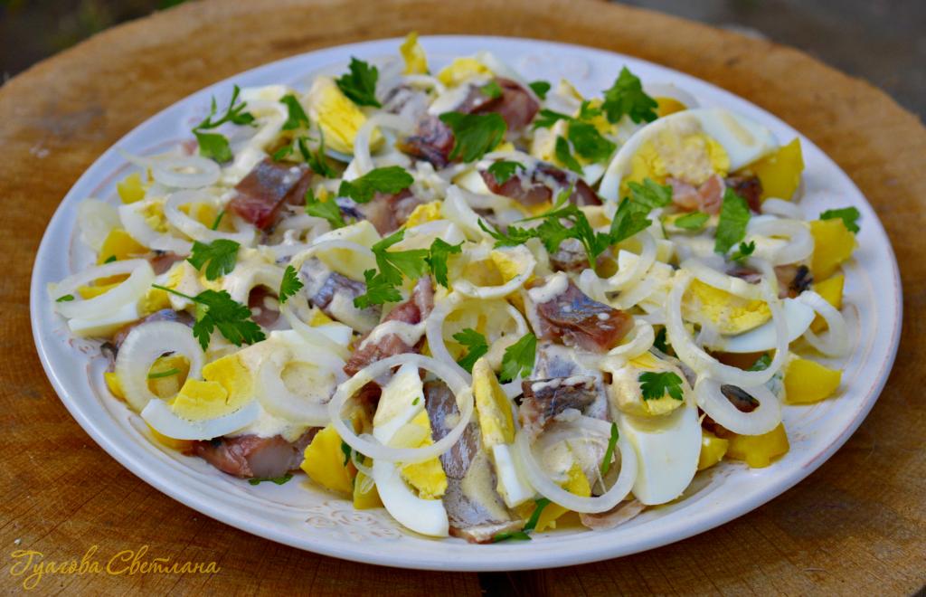 Салат из селедки, яиц, картошки и лука - вкусный, сытный и вполне может заменить основное блюдо. Сочетание сельди, картофеля и маринованного лука понравится практически всем. А яйца дарят этому блюду отличный вкус. Изюминкой этого салата является вкусная горчично-сметанная заправка, которая делает его сочным и интересным.