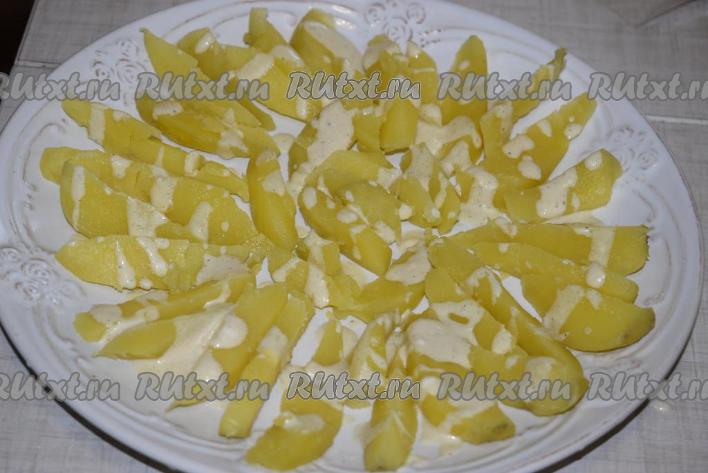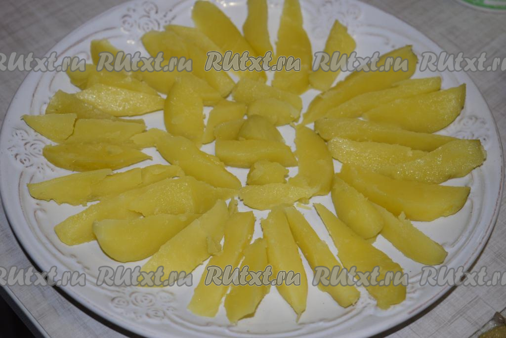 Картофель и яйца нарезаем на крупные продольные дольки. На большое блюдо выкладываем дольки картофеля.