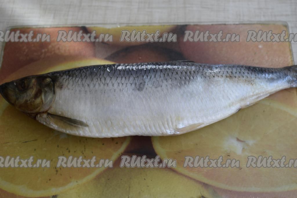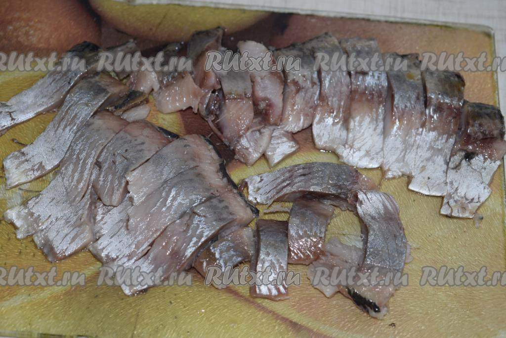 Берем солёную сельдь, отрезаем голову, удаляем внутренности и кожу.