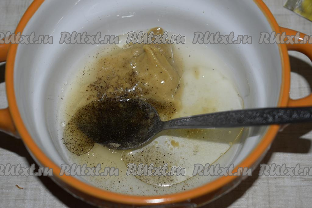 Для приготовления заправки смешиваем в глубокой миске горчицу, соль, сахар, уксус, черный молотый перец, растительное масло.