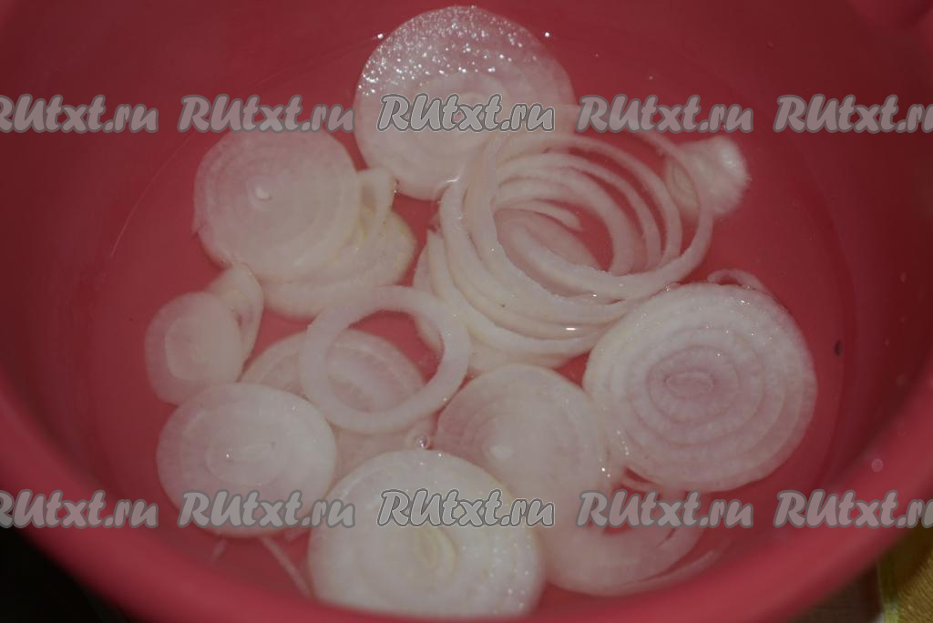 Лук очищаем и нарезаем кольцами. Заливаем луковые кольца кипятком, добавляем щепотку соли, уксус и оставляем промариноваться на 10-15 минут. По истечении времени сливаем маринад, слегка отжимаем лук и выкладываем его на бумажные полотенца, для того чтобы ушла влага.