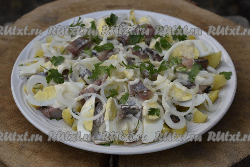 Салат из селедки, яиц, картошки и лука отправляем пропитаться в холодильник, примерно, на 1-2 часа. Очень вкусное, сытное, сочное блюдо подаем к столу охлажденным.