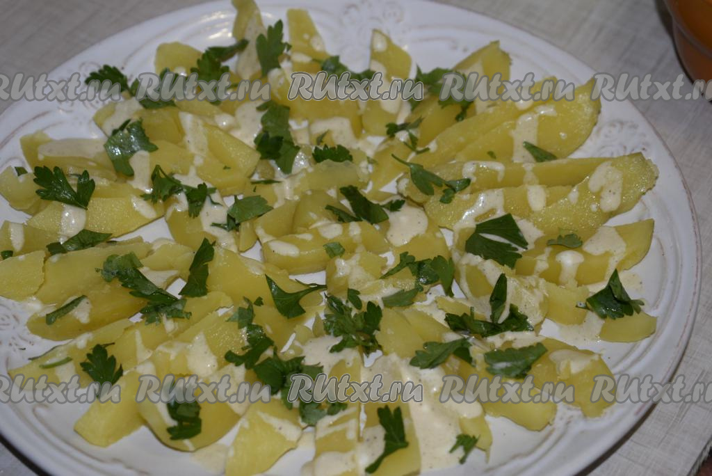 Картошку чуть-чуть присаливаем и поливаем, примерно, 2 столовыми ложками приготовленной заправки.