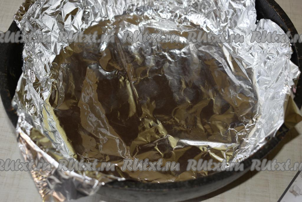 Форму для выпечки (у меня форма диаметром 22 см) застелить пергаментом или фольгой.