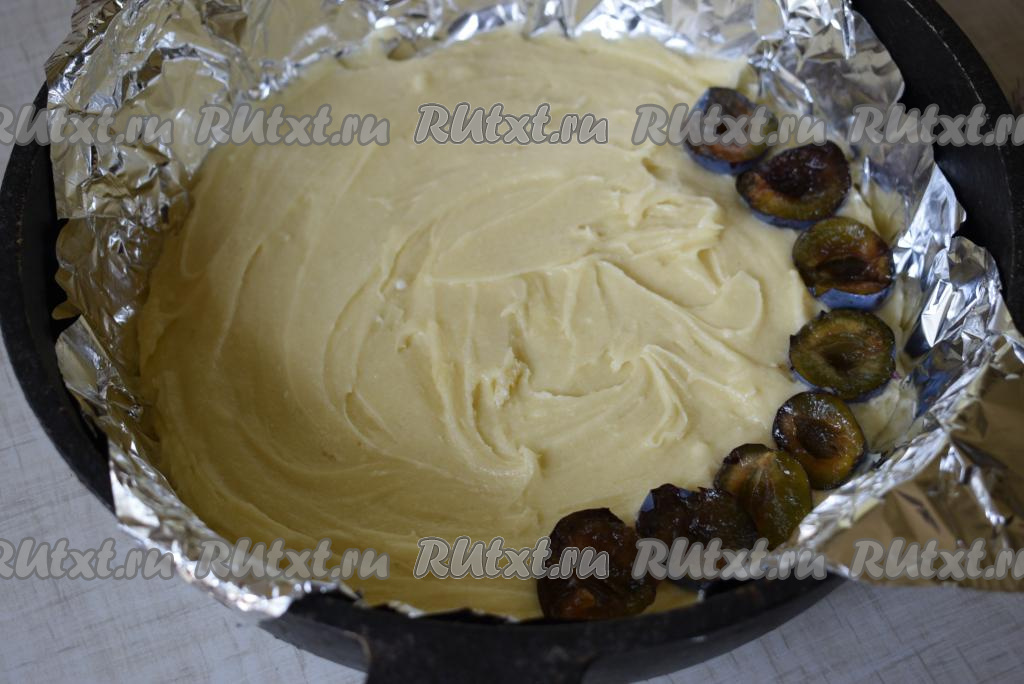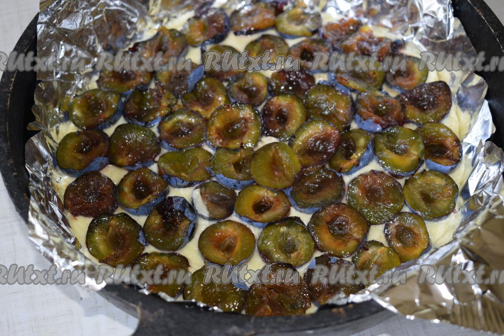 Поверх теста разложить половинки слив срезом вверх, не вдавливая их в тесто!