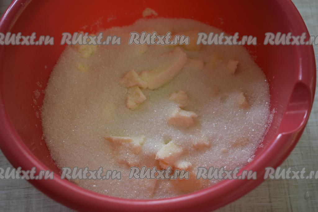 Для приготовления вкусного сливового пирога сначала включаем духовку и даем ей разогреться до температуры 180 градусов. Пока она разогревается, мы приготовим тесто и начинку. Размягченное сливочное масло взбить с 200 граммами сахара (я брала 130 грамм сахара, чтобы пирог получился менее сладким), добавив соль и ванилин.