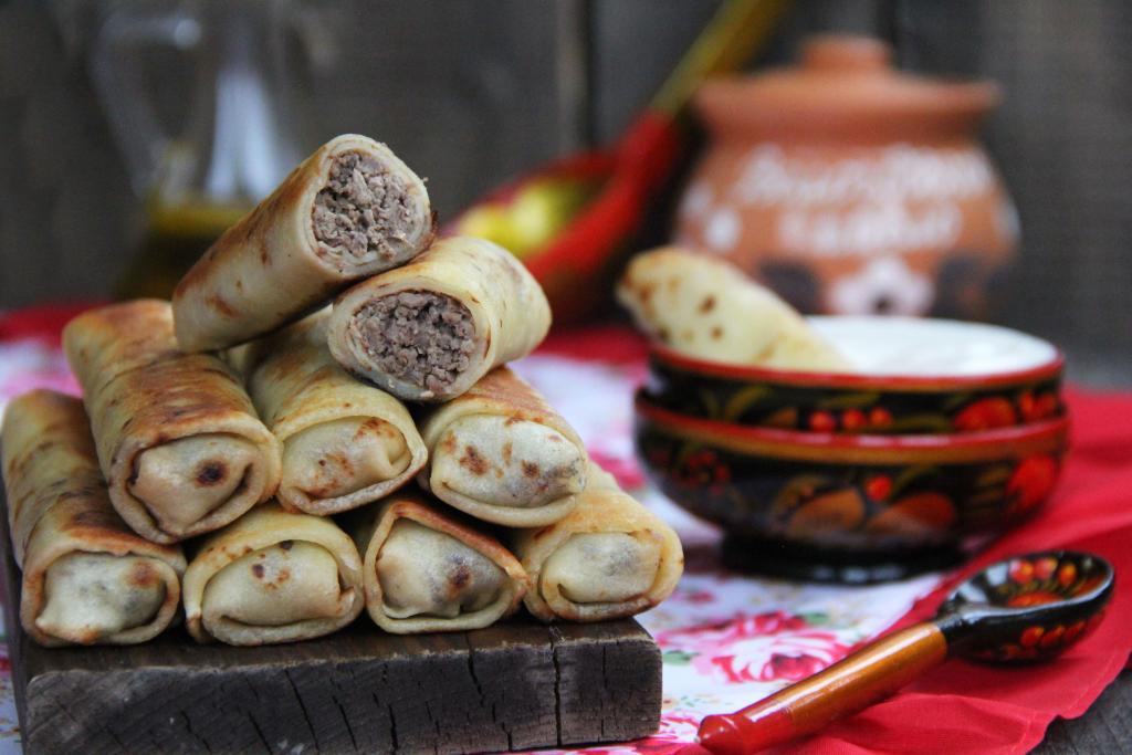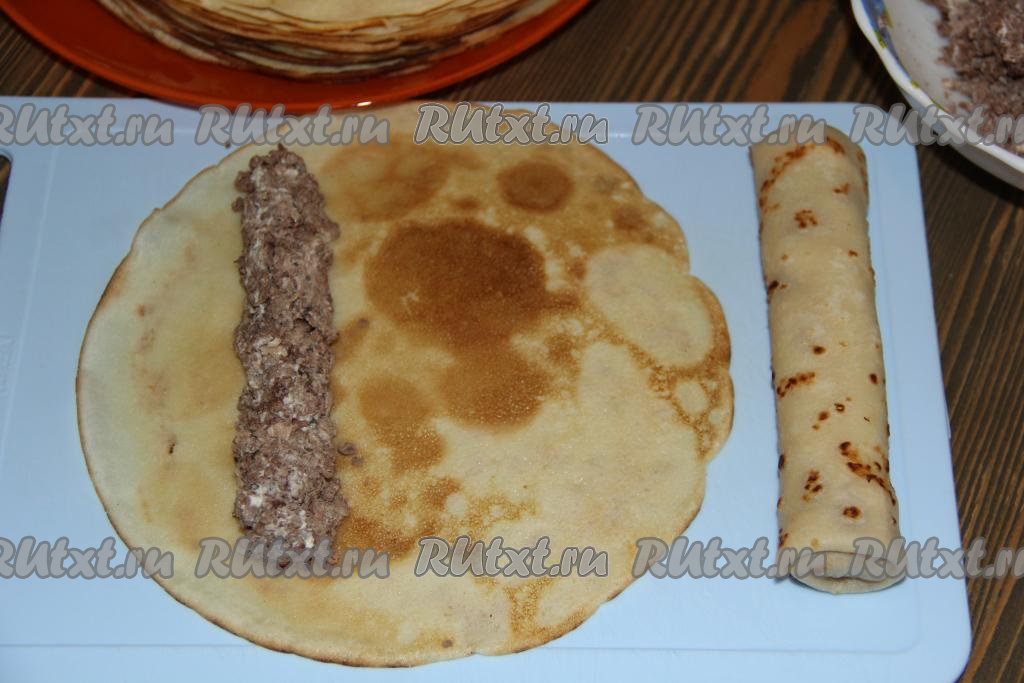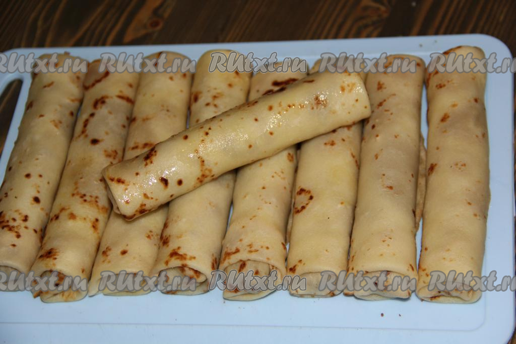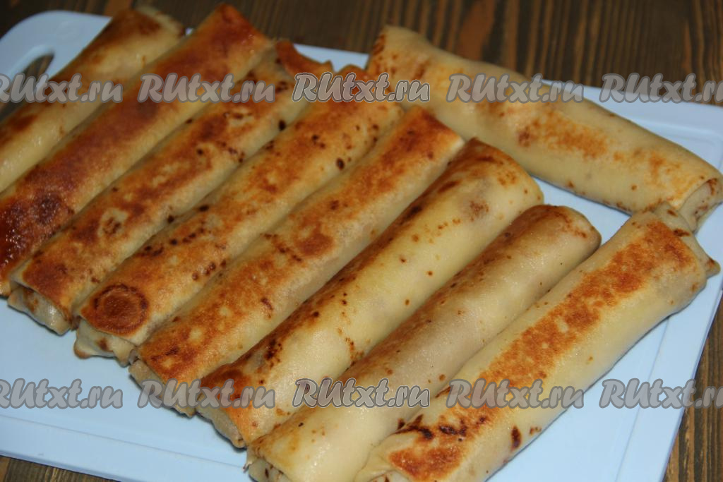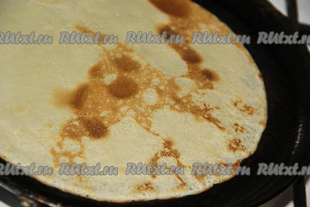 Хорошо разогреть сковороду (перед выпеканием первого блина смажьте сковороду маслом), налить тесто, равномерно его распределить и жарить блинчик на среднем огне до золотистого цвета с двух сторон. Аналогично приготовить все блинчики.