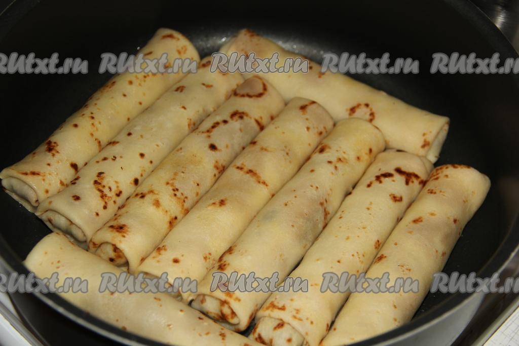 Сковороду разогреть, добавить немного масла и выложить наши блинчики с начинкой.
