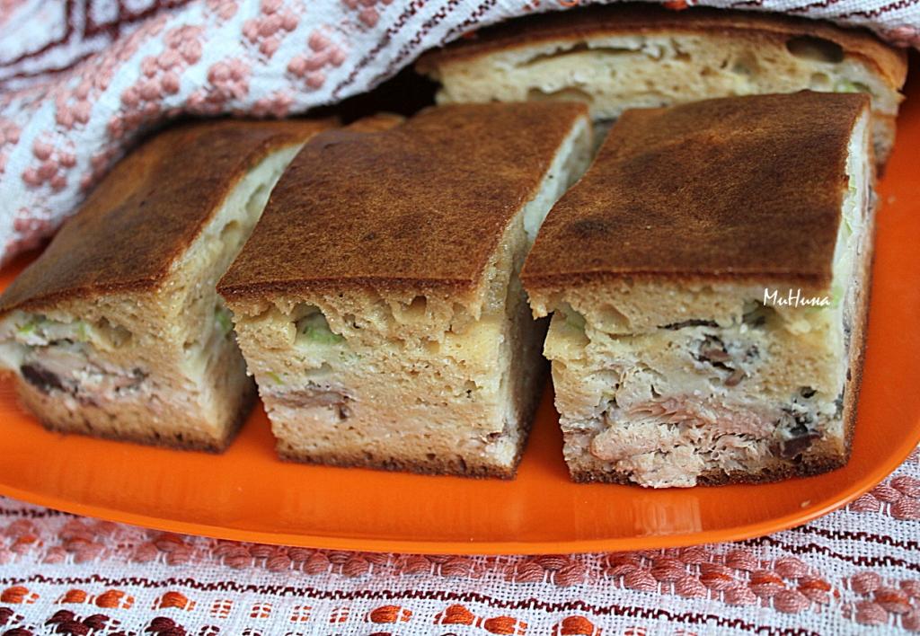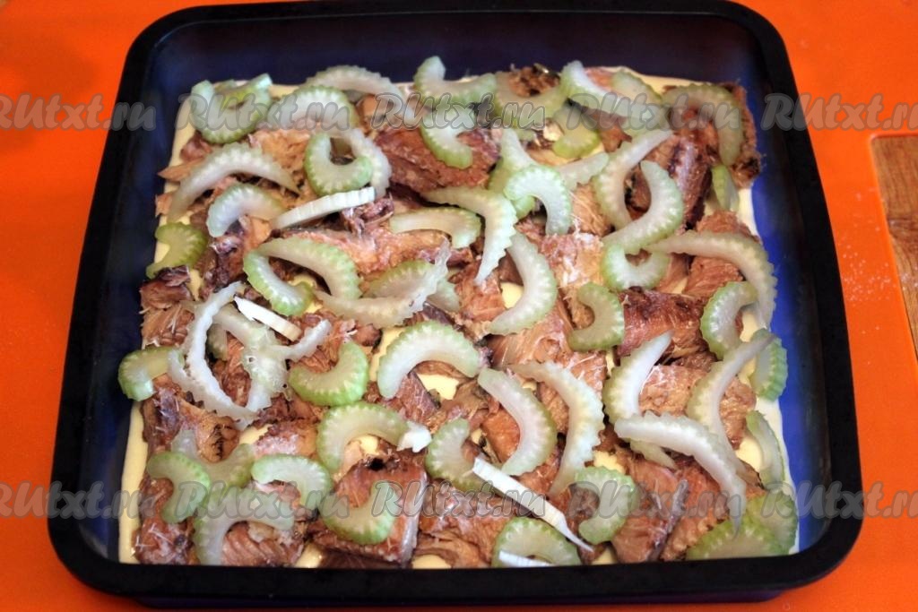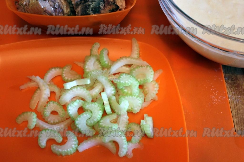 Предлагаю рецепт пирога с рыбными консервами из сметанного теста. В качестве начинки для пирога используются консервы из рыбы в собственном соку или в масле и стеблевой сельдерей. Тесто не замешивается, а получается жидким. В общем, всё просто, доступно, быстро и вкусно.