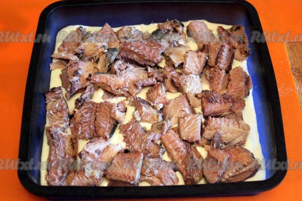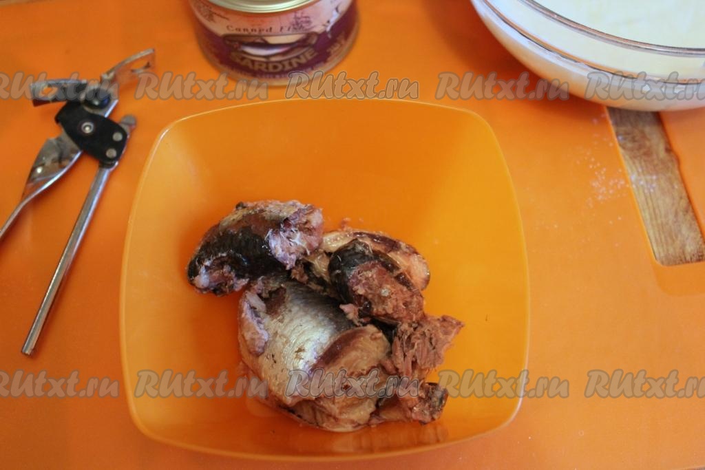 Для начинки пирога подготовьте рыбу из консервов, т.е. немного поломайте её на кусочки и слейте жидкость.