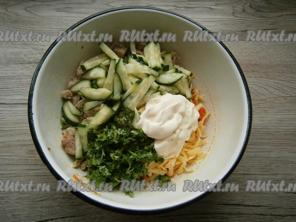 Сюда же добавить нарезанный брусочками огурец и майонез.