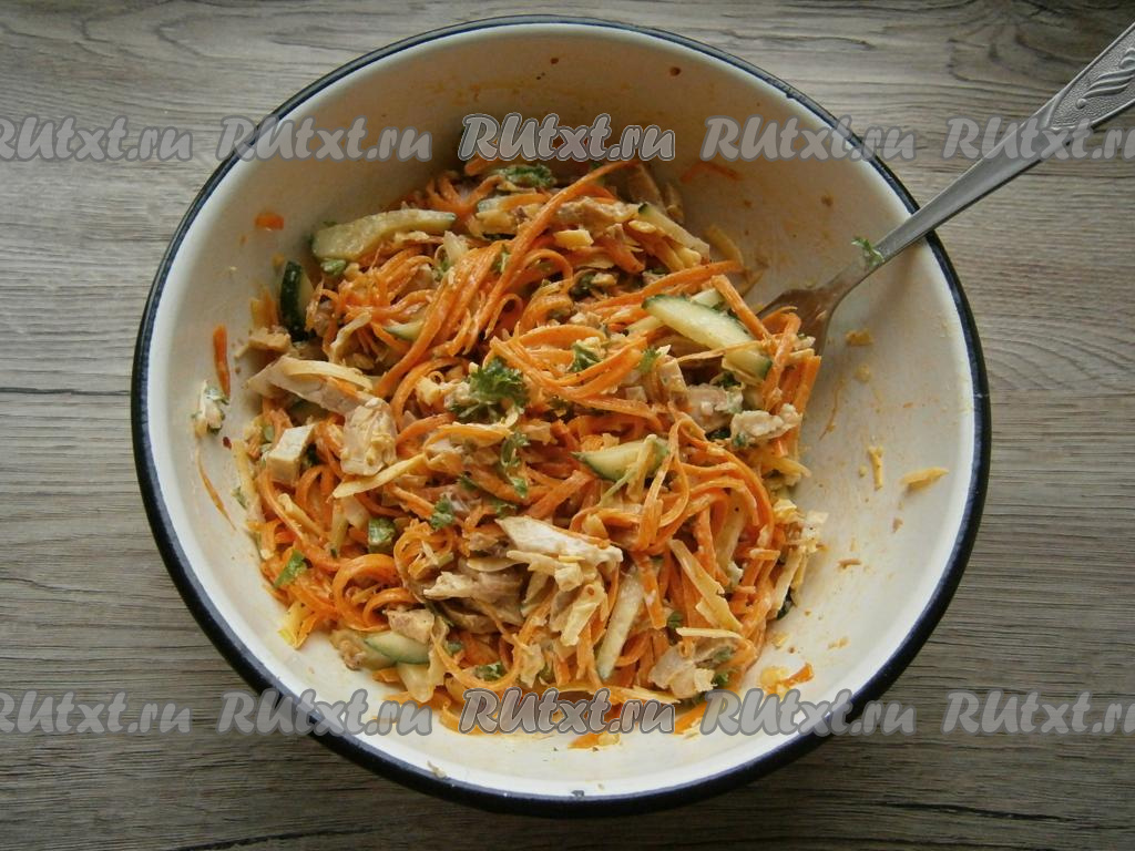 Вы не потратите много времени на приготовление этого салата из курицы, огурцов и корейской моркови, однако его прекрасный вкус понравится многим. Это блюдо займёт достойное место на вашем столе и в будни, и в праздники. Я готовила этот салатик со свежим огурчиком, но, для того чтобы сделать вкус более насыщенным, можно взять и маринованный огурец. Отличный салатик, попробуйте!