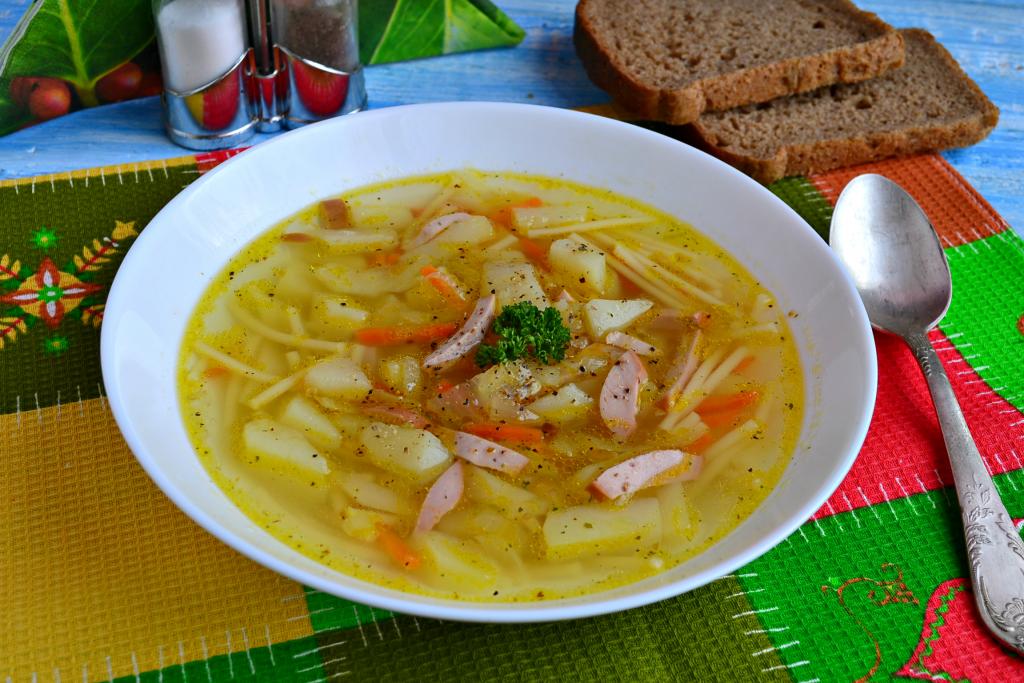 Предлагаю вам рецепт простого, сытного и очень вкусного супа с колбасой и вермишелью. Его можно приготовить на скорую руку, так как варится он на воде. Единственная тонкость - колбасу нужно использовать только качественную, высшего сорта. Надеюсь, вам понравится это абсолютно не сложное блюдо и оно станет палочкой-выручалочкой, когда нужно быстро и сытно накормить всю семью.