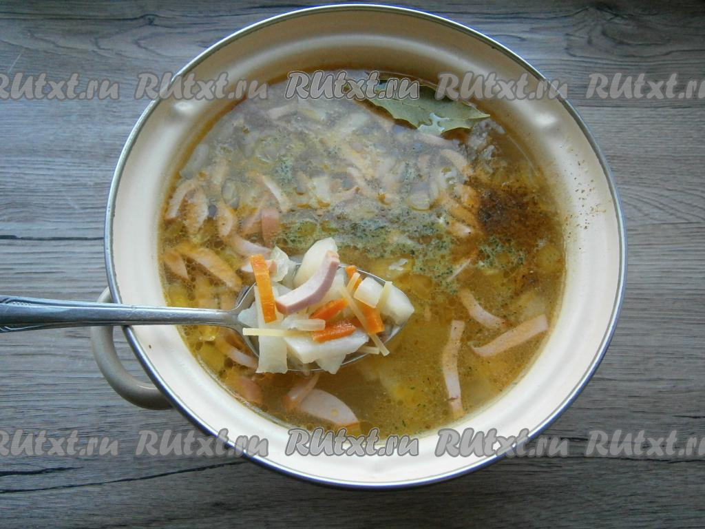 Когда картофель будет почти готов, добавить в кастрюлю обжаренные лук с морковью, колбасу и вермишель. Также добавить лавровый лист, специи, приправу для супа и измельченный очищенный чеснок. Потомить суп на слабом огне еще минут 10.