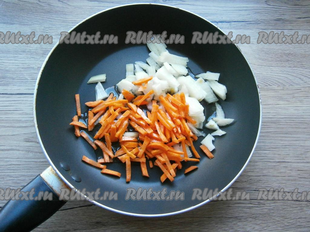 Лук и морковь очистить, нарезать лук небольшими кусочками, морковь - соломкой. Выложить овощи в сковороду, влить растительное масло.