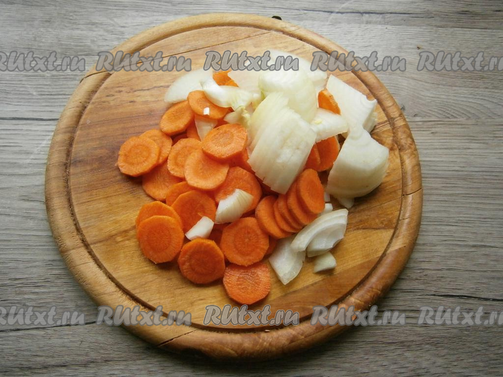 Очистить морковку и лук. Морковь нарезать тонкими кружочками или полукружочками, лук - тонкими четвертинами.