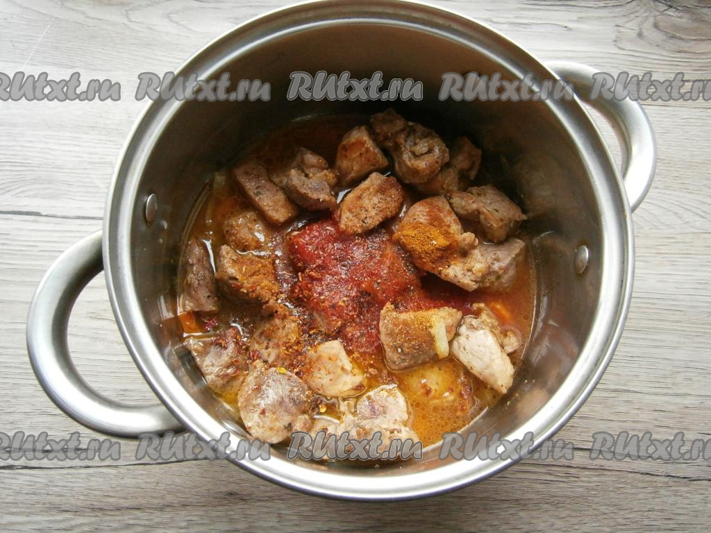 В кастрюлю со свининой, морковью и луком добавить томатную пасту, всыпать соль по вкусу, добавить еще немного специй и красный молотый перец, влить горячую воду (мясо должно быть покрыто водой, практически полностью). Добавить чуть сахара и тушить мясо с овощами на небольшом огне с прикрытой крышкой 40-45 минут с момента закипания. Готовое мясо должно стать мягким (оно будет легко прокалываться вилкой).