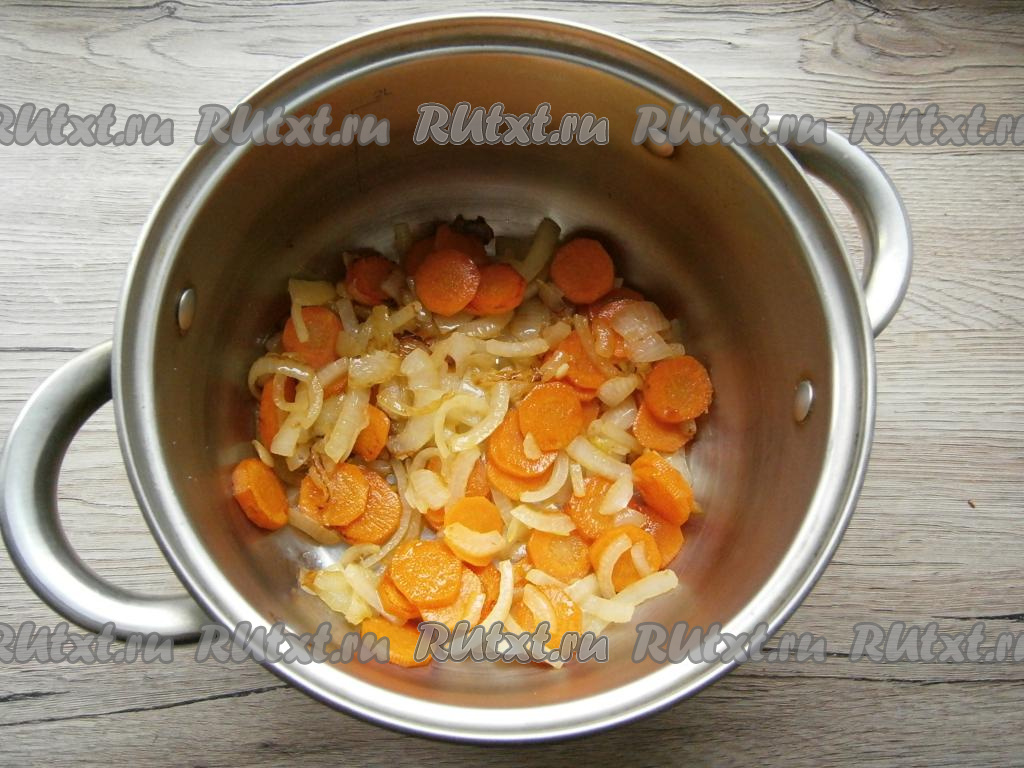 Выложить лук с морковью в кастрюлю с толстым дном.