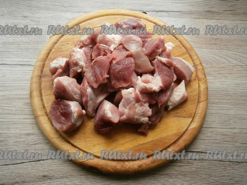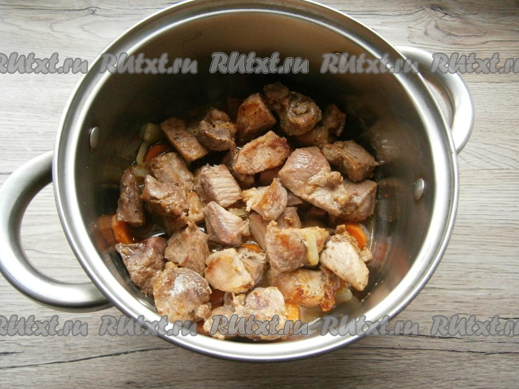 На сковороду налить 2-3 столовые ложки растительного масла, добавить кусочки свинины, обжарить их на среднем огне до небольшой румяности со всех сторон, затем выложить мясо в кастрюлю поверх овощей.