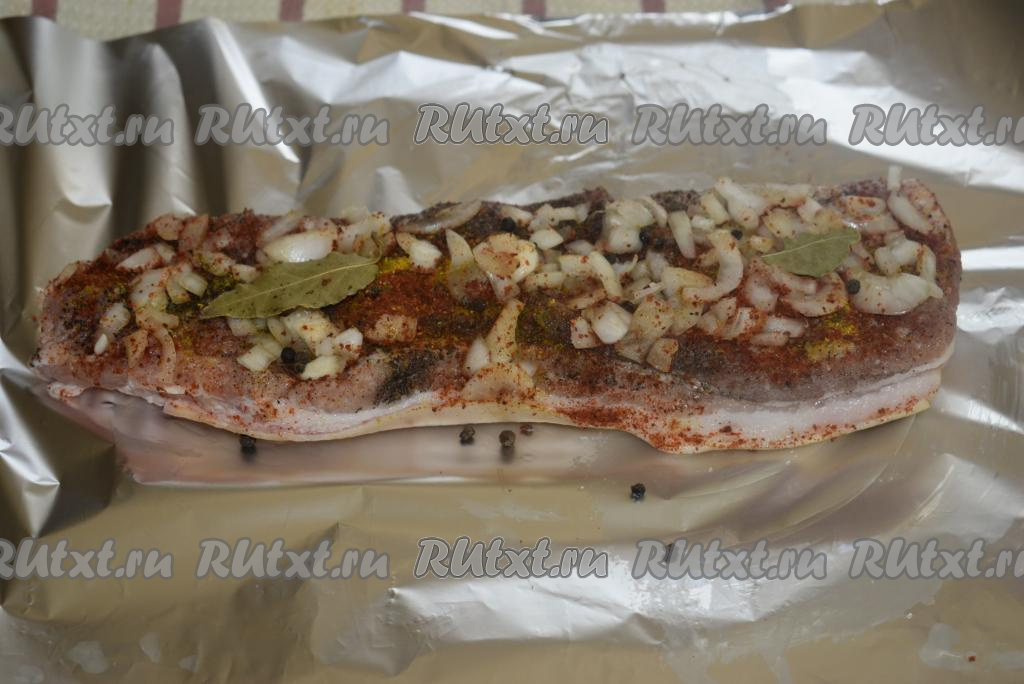 Сверху посыпаем грудинку луком, нарезанным на кубики, черным перцем горошком, выкладываем лавровые листья. Специи, лук и чеснок сделают мясо очень ароматным. Кладем грудинку на фольгу шкуркой вниз, закрываем края фольги плотно и оставляем на 1 час промариноваться.