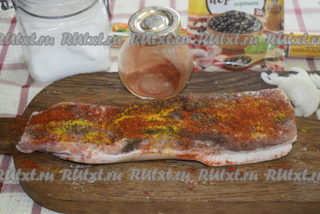 Натираем грудинку солью, я использую для этого чесночную соль.