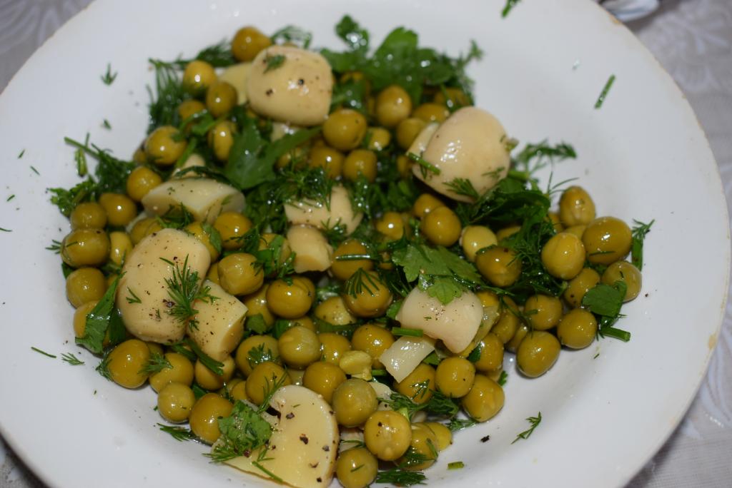 По желанию, можно подсолить салат, но я этого не делаю, мне вполне хватает соли в консервированных овощах. Салат с консервированными шампиньонами и зеленым горошком готов. Буквально за несколько минут у вас на столе будет замечательный салатик, который прекрасно подойдет к любым горячим блюдам и разнообразит ваше повседневное меню.