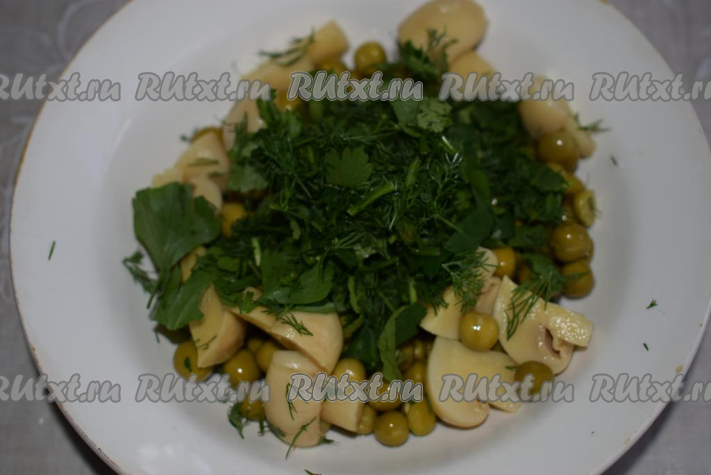 Мелко нарезанную зелень выкладываем в салат из консервированных шампиньонов и горошка.