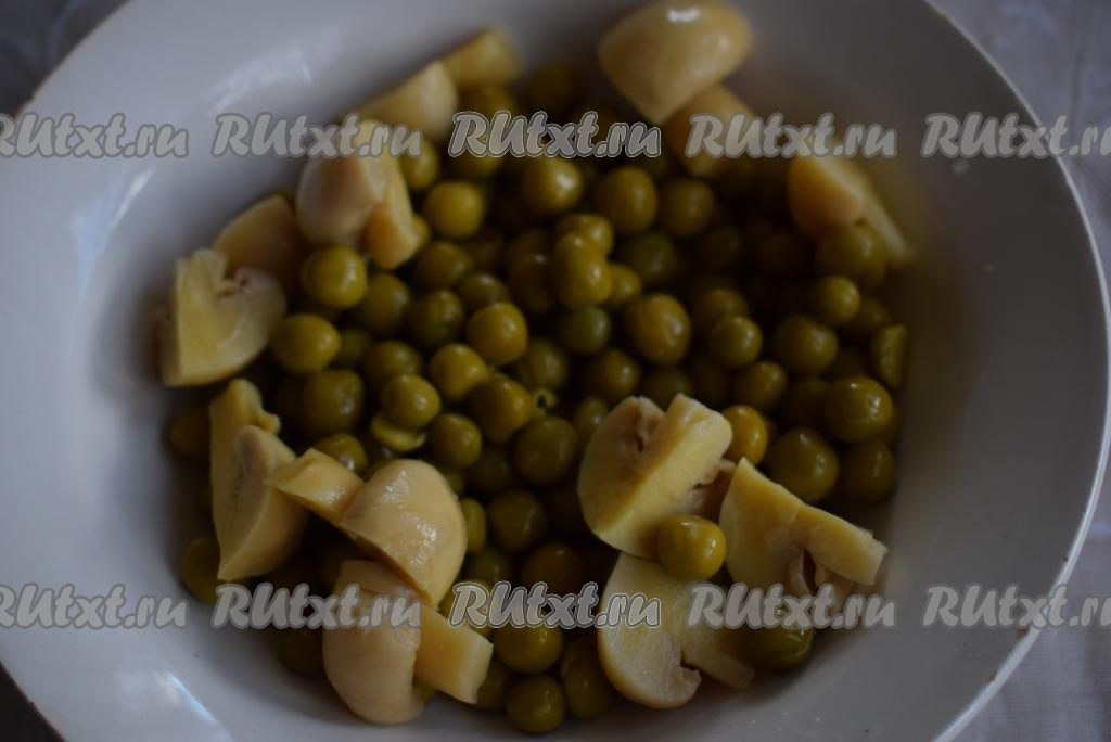 Из банки с зеленым горошком сливаем жидкость, горошек выкладываем в миску. Консервированные шампиньоны режем на крупные дольки и выкладываем к горошку.