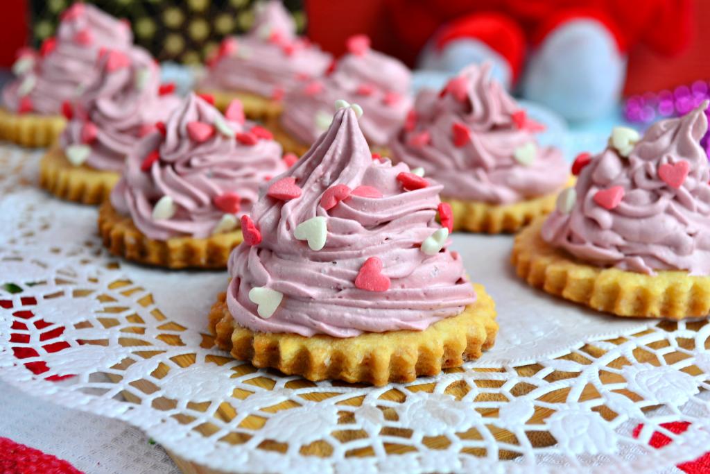 На песочные основы выдавить фигурно крем, украсить сахарной присыпкой. Вот и все! Вкуснейшее песочное пирожное с белковым кремом понравится и деткам, и взрослым, попробуйте!