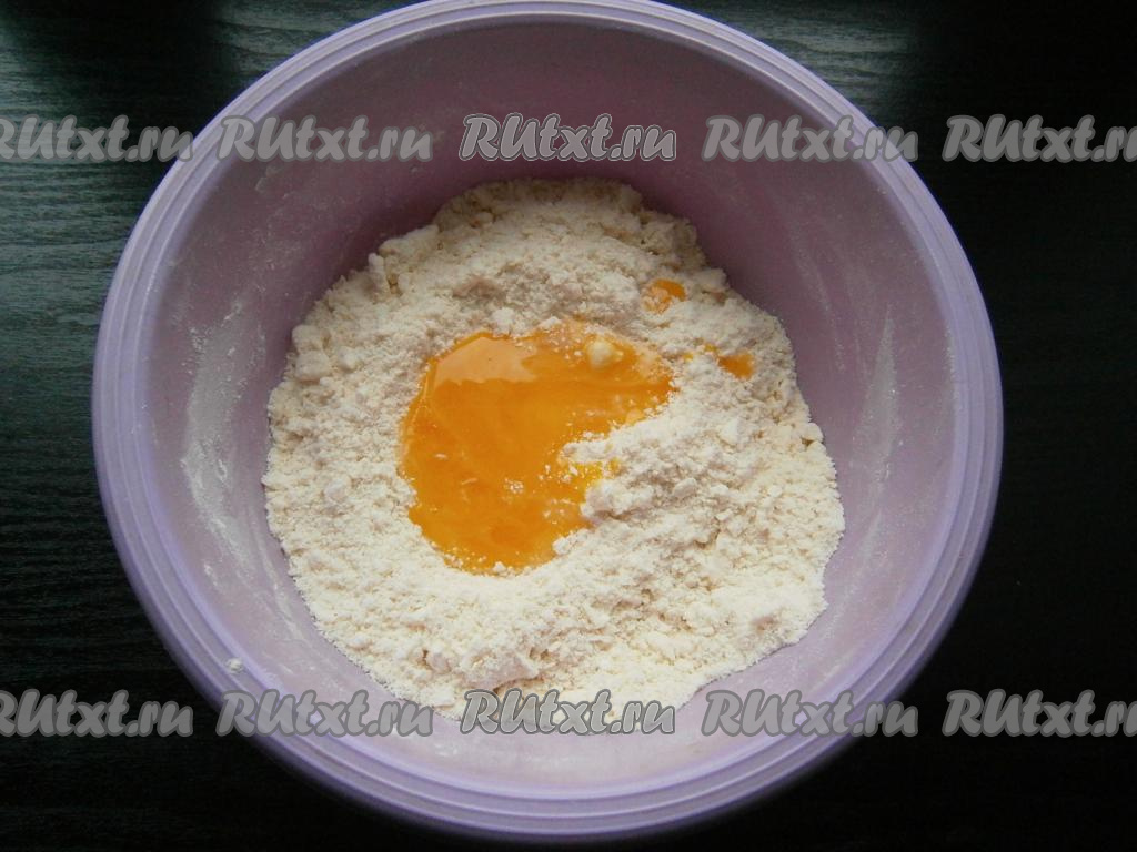 Руками тщательно перетереть массу в крошку. Затем добавить сырые яичные желтки.