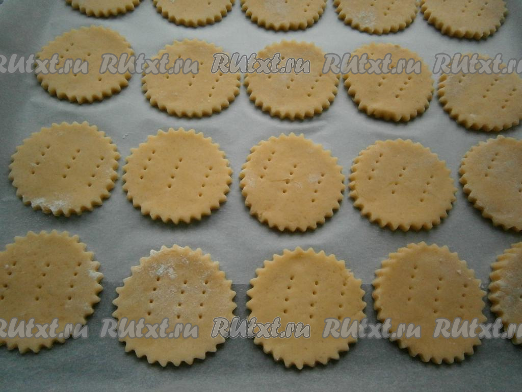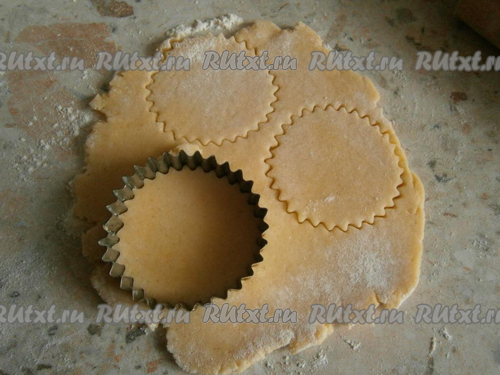 Далее на столе, присыпанном мукой, раскатать тесто в лепешку толщиной около 0,5 см и формочкой вырезать кружочки.