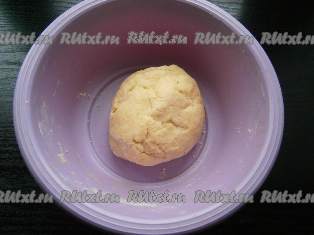 Быстренько замесить тесто, которое будет достаточно плотным и крутым. Тесто накрыть пищевой пленкой и поместить в холодильник на 15 минут.