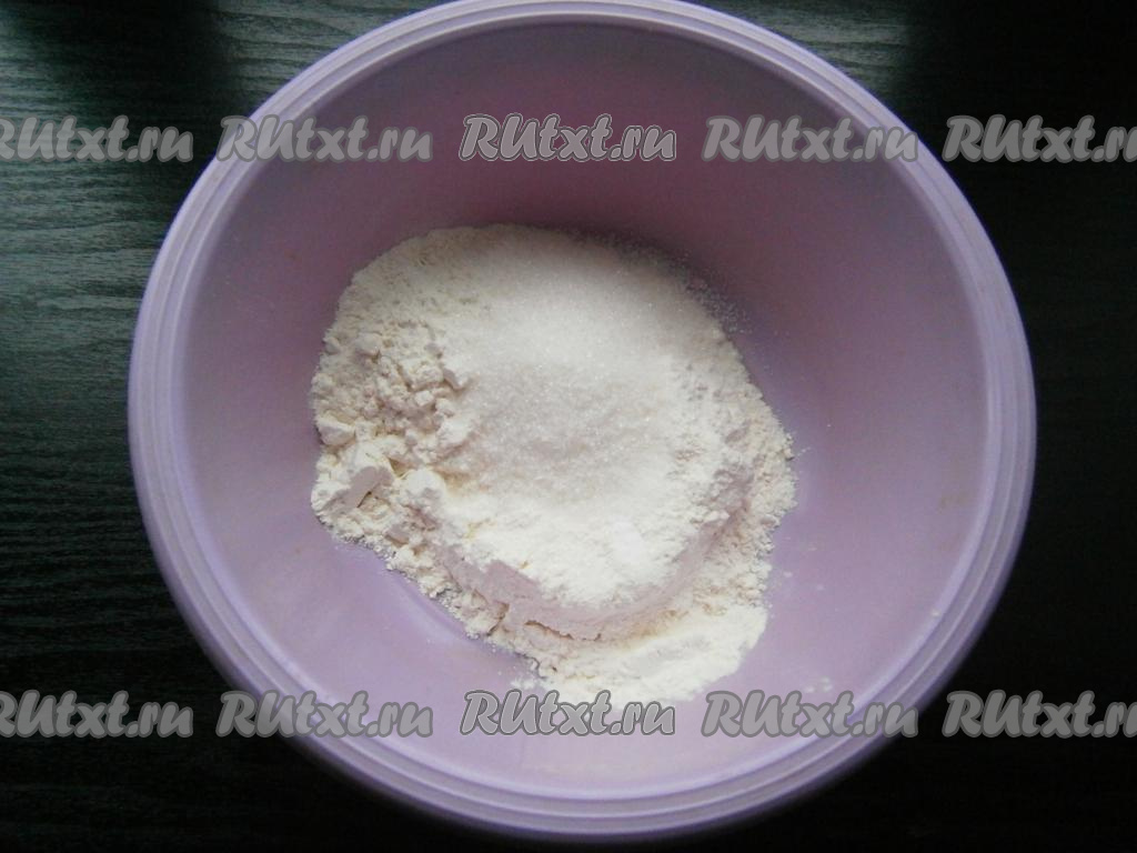 К муке добавить сахар и соду, перемешать.