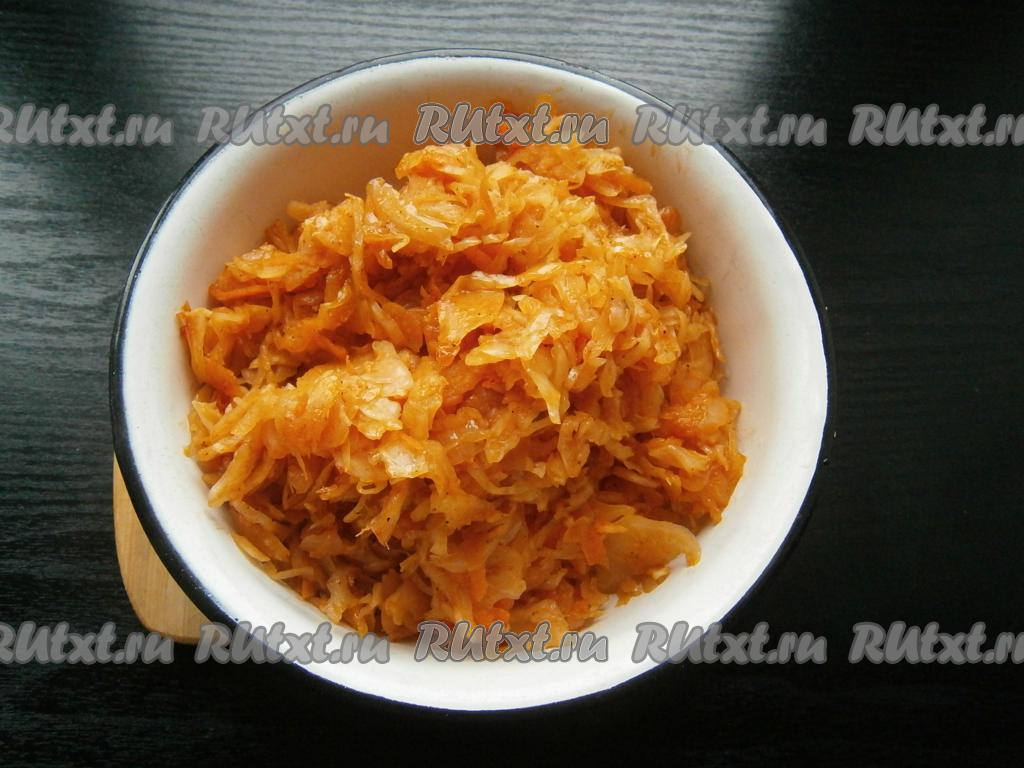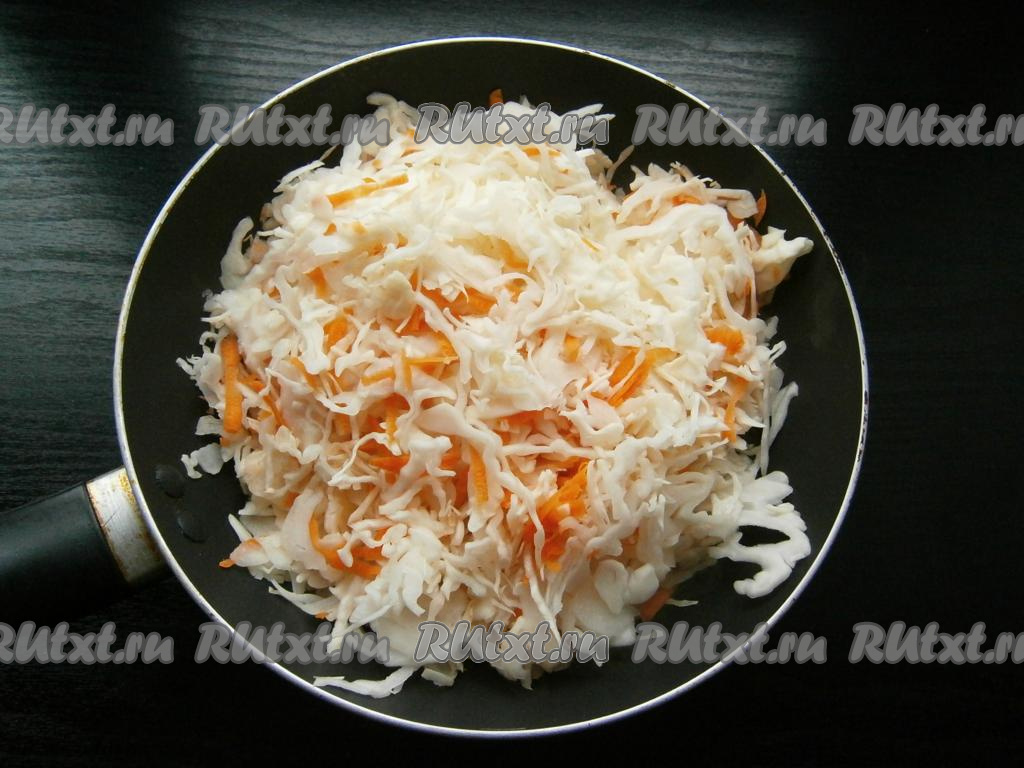 Капусту нашинковать и порубить ножом, смешать с натертой очищенной морковью, посолить, помять немного руками. Поместить капусту в сковороду с растительным маслом.